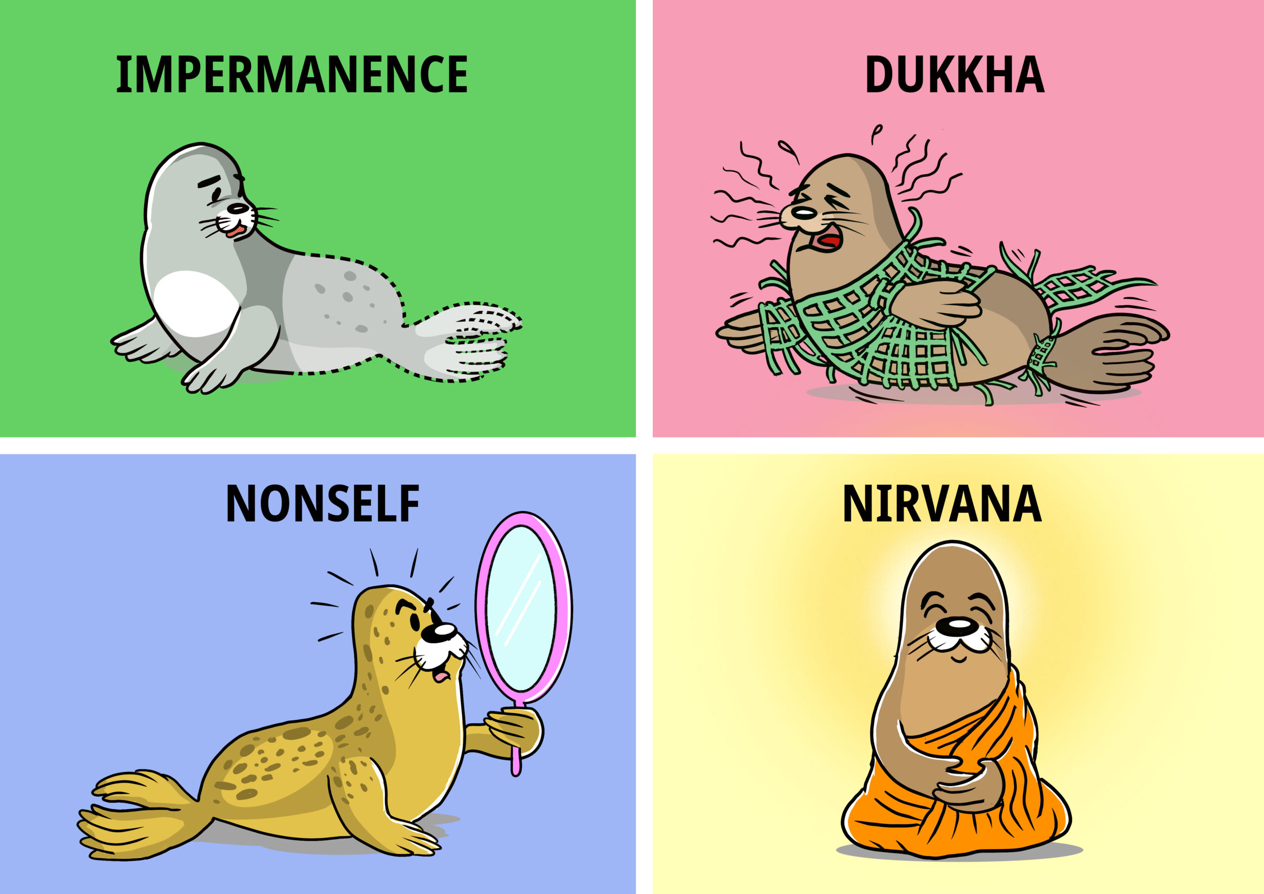 These three marks are so important they can almost be said to define Buddhism. As Buddhism evolved, there arose an idea called the Dharma seals. See, some large number of years after the Buddha passed, Buddhism spread widely and there were many schools and sub-schools of Buddhism, some of which also absorbed local customs, practices and beliefs. So, how do we know which is “true” Dharma and which is not? The standard, which appears to enjoy consensus among all schools of Buddhism, is to measure against the four Dharma seals, the first three of which are the three marks of existence, and the fourth is nirvana.[7] If a school of Buddhism brings forth insight into the three marks of existence, and also leads to nirvana, then it can be said to be true Dharma.