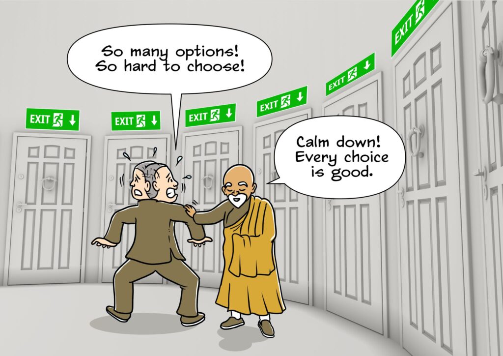 One key lesson here is the same one you encounter over and over in the study of Buddhism: there are many doors to liberation. There are many legitimate and effective doorways to the ending of ignorance and suffering. Hence, if you encounter a discourse that says, “This is the way out,” and another that says, “That is the way out,” know that they are not mutually exclusive. They are like the green “exit” signs surrounding the cinema, every one of them points to a legitimate way out. As long as it eventually ends ignorance, it is legit.