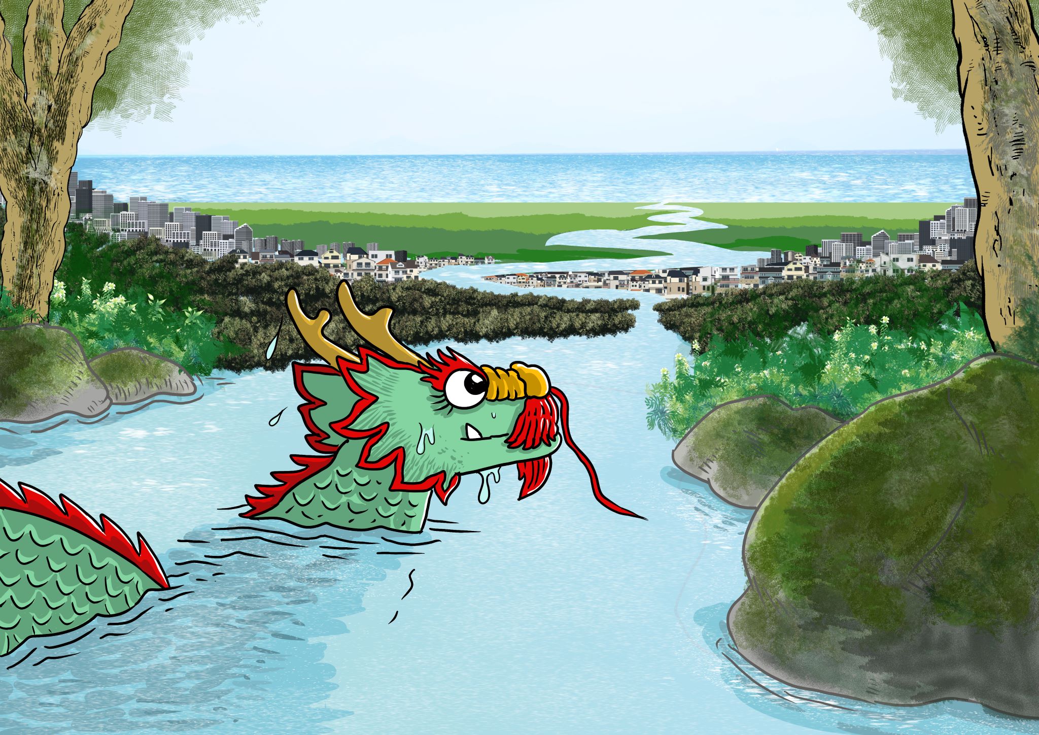 Once upon a time, a god dropped a dragon pearl into a pond deep inland by accident. The pearl later transformed into a little baby dragon. As he got older, he learned that he was actually a sea dragon, so the only way he could grow into a full adult was to be in the sea. But he looked all around and the sea was nowhere to be found. What to do? Fortunately, a wise old tortoise told him, “All you have to do is to find your way to a stream, then flow with the current, and you will eventually reach the sea. Trust me.”