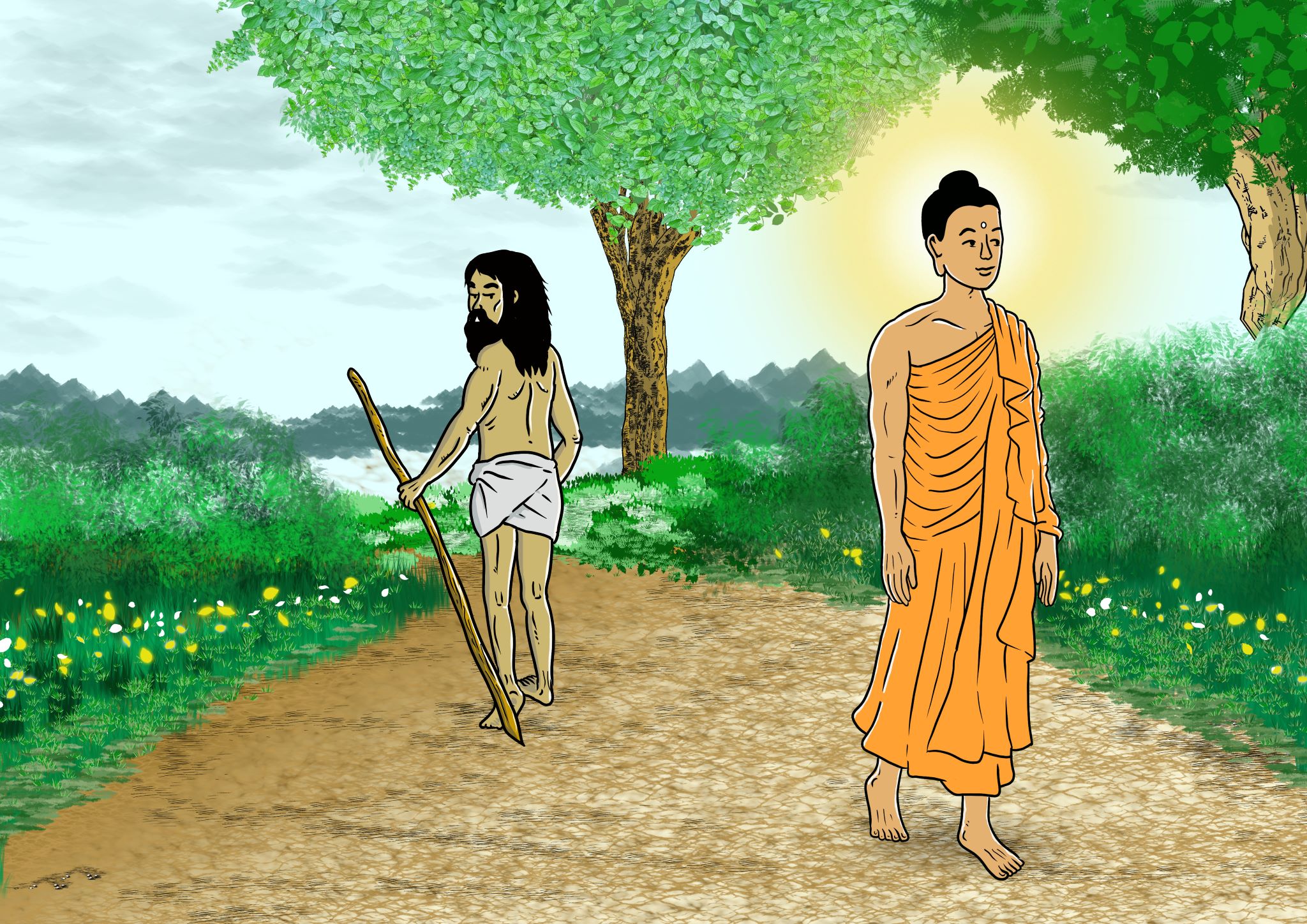 This story occurred not long after the Buddha’s enlightenment. He had no disciples at this time, and he was walking to where he knew his five former companions were so that he could teach them the Dharma. On his way, he met his first potential disciple, and that did not go well.