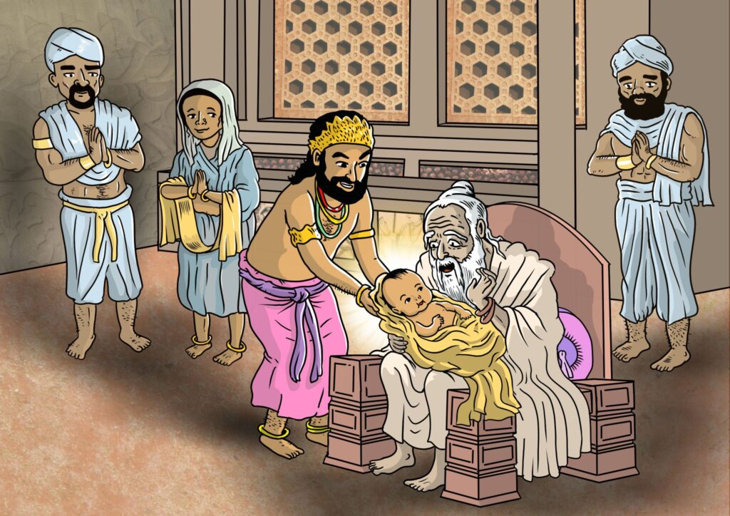 When the baby was five days old, in keeping with local tradition, a naming ceremony was held and the prince was named Siddhattha Gotama. Siddhattha means “wish fulfilled” and Gotama was the family name (also commonly spelled as Gautama).[3] As part of the ceremony, eight distinguished Brahmin scholars were invited to read the baby’s future. Seven of the scholars predicted that young Siddhattha would one day grow up either to be a great king (a “universal monarch”) or a great sage. The youngest of the eight, Koṇḍañña, confidently predicted that Siddhattha would grow up to become a buddha, a fully enlightened one. Many years later, Koṇḍañña would become an early student of the Buddha and the very first to reach enlightenment.[4]