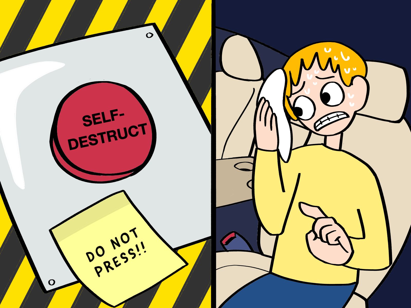 But even before learning to uninstall the self-destruct feature in your car, there is an essential first step: facing the fact that it is actually there. Imagine you bought yourself one of those cars with the self-destruct add-on. Why? Because it is 20% off (just for the add-on, not for the whole car!), and it is really hard to resist 20% off, I know. Trust me, I know. But you have buyer’s remorse very soon after that, especially considering how you’re going to have to explain to your spouse why you paid extra for a self-destruct button. What to do? Well, you can always pretend it is not there, and put duct tape over it to hide it from your spouse or something. Unfortunately, pretending it is not there will not solve the problem. Every time you put your large drink in the cupholder, you could miss and accidently trigger self-destruct, whether or not you pretend it is not there. The only real solution is to uninstall it, and there is no way to begin without first facing the fact that it is there.