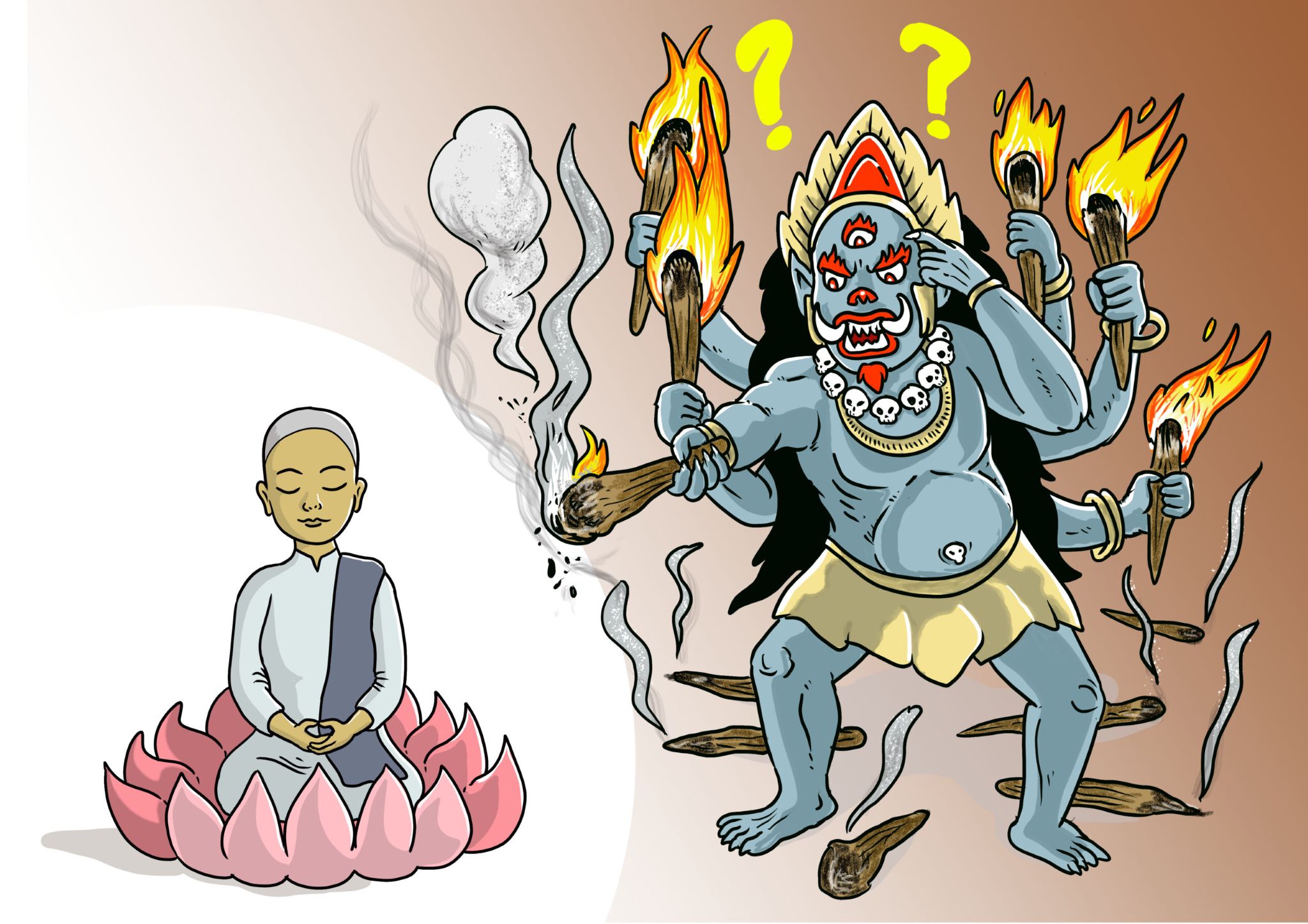 He repeated the same thing for all the other five senses, and then compared such a mind to a well-constructed building that is built fire-resistant, “Suppose, friends, there is a peaked house or hall built of thickly packed clay and freshly plastered. If a man approaches from any direction with a blazing grass torch, the fire fails to gain access to it, fails to get a hold on it. In the same way, when a monk dwells thus, even if Mara [personifying suffering] approaches him through any of the senses, Mara fails to gain access to him, fails to get a hold on him.”