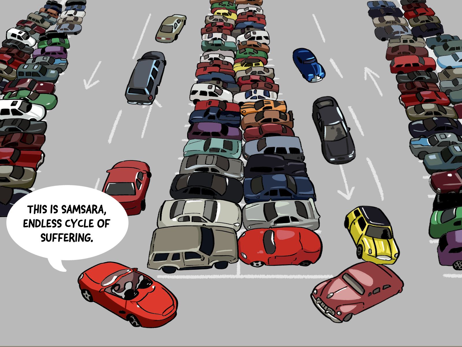 Once, I was at a large carpark at a retreat center. It was totally full. There was a large overflow parking lot that was mostly empty, but there was no proper signage to point drivers to it, so nobody knew it existed, hence the cars just kept literally circling the main carpark endlessly in a futile search for parking. And I told my wife, “See, that is samsara, endless cycle of suffering.”