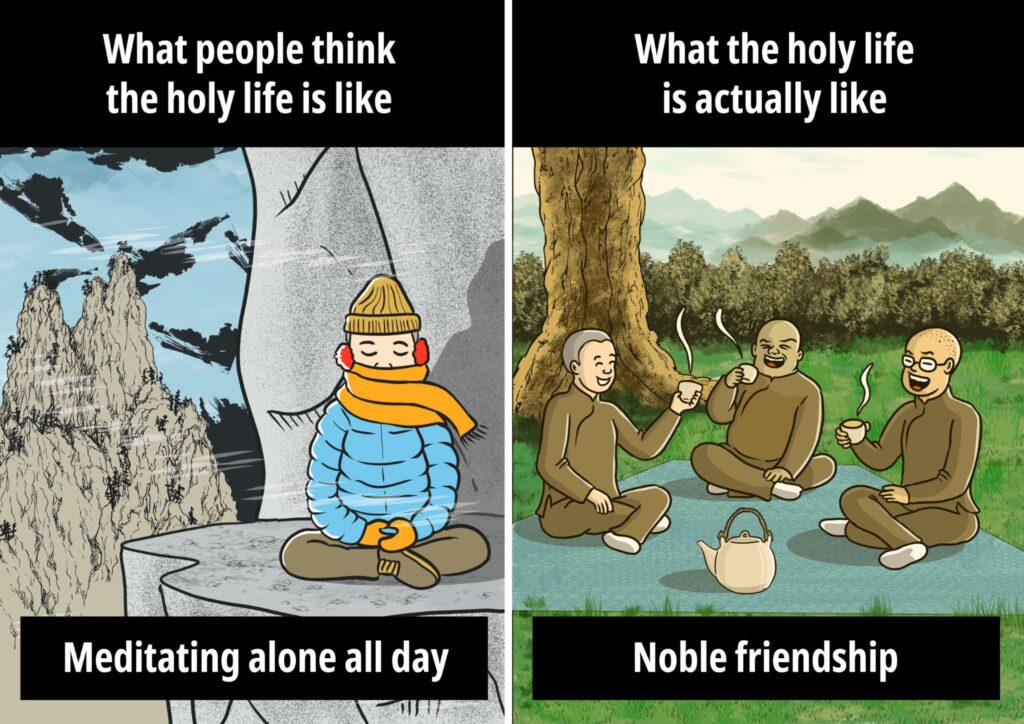 But wait, there is even more. The most important thing about the Buddha’s teachings on relating to others is that they are a vital part of the core spiritual training. If you buy into the impression that Buddhism is exclusively solitary, you might think that “real Buddhism” is sitting alone under a tree, while relating to others is what you do in your free time. In fact, it is quite the opposite. The Buddha’s attendant Ānanda once told the Buddha that he realized “half of the holy life is good friendship.” He was in for a surprise. The Buddha said to him, “No, Ānanda, the whole of the holy life is good friendship.”[10]