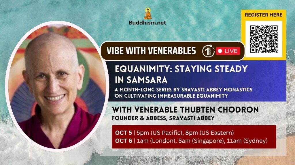 Venerable Thubten Chodron and Sravasti Abbey monastics will guide us in understanding the immeasurable quality of equanimity. How do we maintain a balanced mind, free from attachment and aversion, amidst life’s constant ebb and flow? We explore how to awaken to the profound realization that the mind, like the vast sky, is untouched by the storms of life. Discover how cultivating equanimity allows us to experience life fully, with serenity, wisdom, and clarity, even in the face of challenges, success, or failure. This series will guide us in deepening our practice of balance and resilience, ultimately leading to freedom of the heart, where the mind remains unshaken and peaceful, no matter what arises.